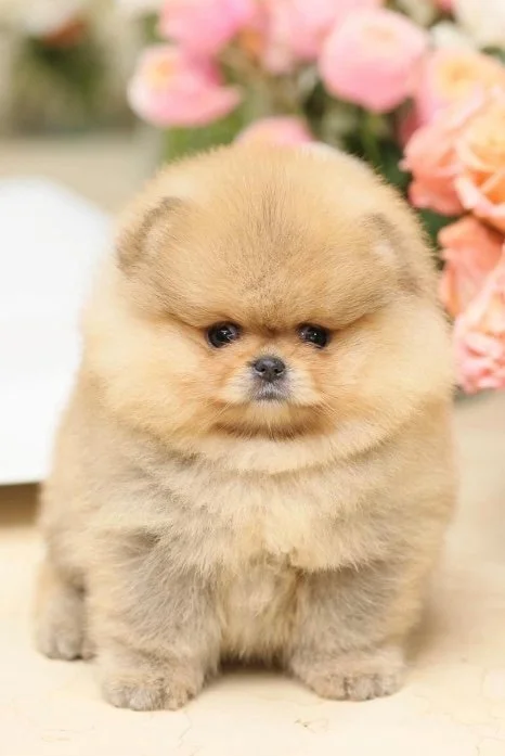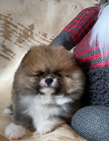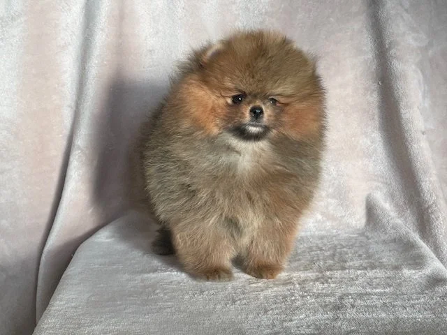 This male Pom puppy truly is a soft and easy going teddy bear. He will mature around five pounds as an adult. Even though he is not white, he closely resembles his sire in looks and personality.